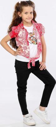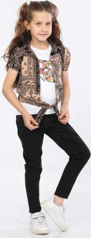 Mornio Kız Çocuk Yazlık ve Mevsimlik 3'lü Takım: Etnik desen Alttan Bağlamalı Renkli Gömlek, Tişört ve Kot Pantolon