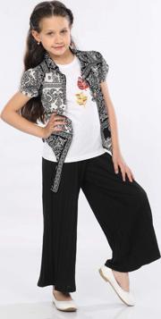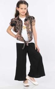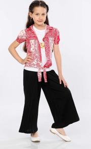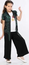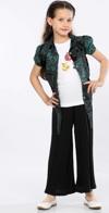 Mornio Kız Çocuk 3'lü Takım: Etnik Desenli Alttan Bağlamalı Gömlek, Sıfır Kollu T-shirt ve Geniş Paça Pantolon