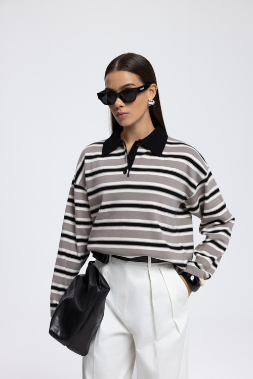 Rahat formda, düğmeli, polo yaka. Uzun kollu ringelli triko kazak.