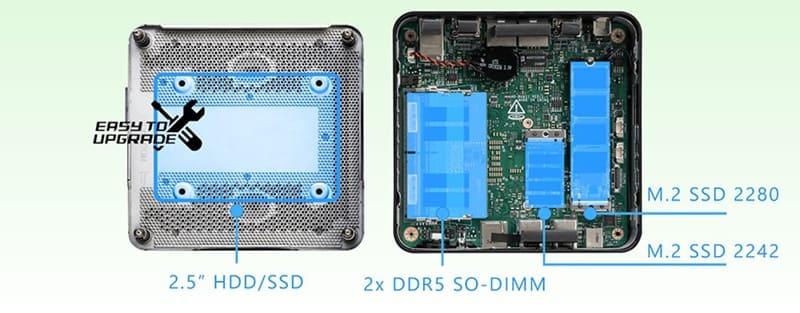 Kullanıcılar kapağı sökerek bir adet SO-DIMM SO-DIMM, 2 adet M.2 SSD (2280 ve 2242), veya bir adet 2.5” HDD/SSD yuvasına kolayca ulaşabilirler. Cubi NUC serisini çok daha esnek bir masaüstü bilgisayar haline getirdik ve yükseltme için geçen süreyi azalttık.