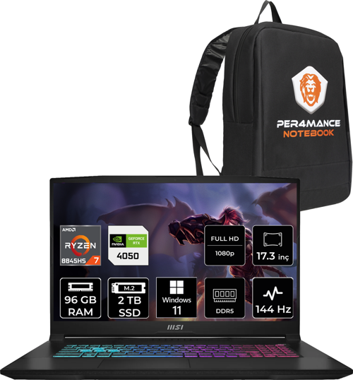 MSI Katana A17 AI AMD Ryzen 7 8845HS 96GB 2TB SSD RTX4050/6GB 17.3" FHD 144Hz W11P Taşınabilir Bilgisayar B8VE-853XTR & PER4 ÇANTA B8VE853XTRP419