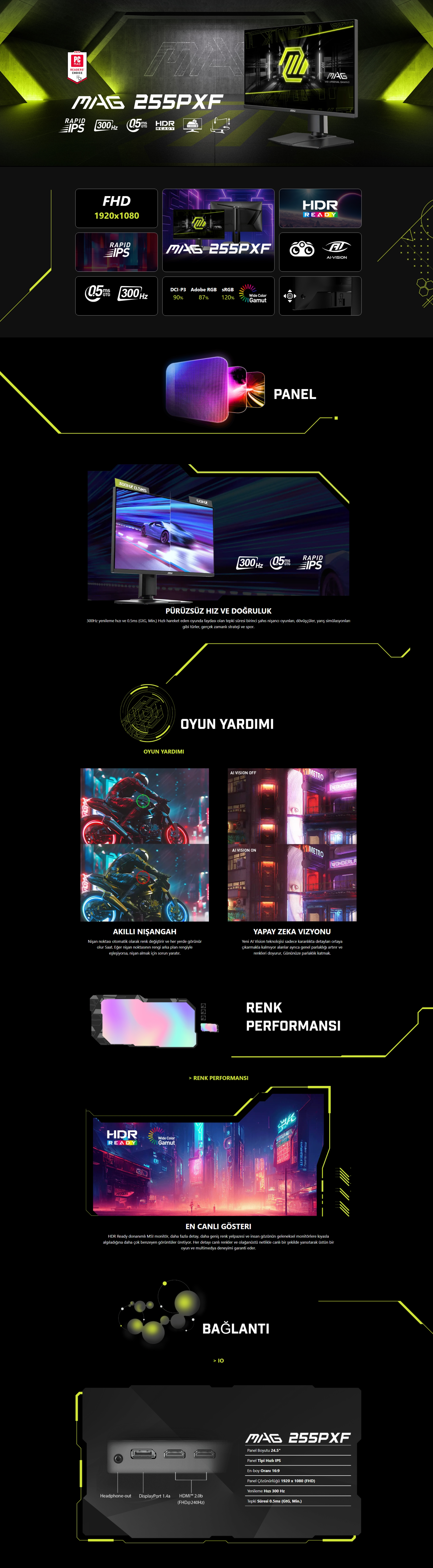 MSI MAG 255PXF 24.5 1920x1080 FHD 300Hz 0.5ms HDMI DP FreeSync Premium IPS Gaming Monitör