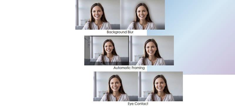Profesyonel ve ilgi çekici bir görüntülü görüşme için arkaplan efektleri, göz teması düzeltmesi, otomatik çerçeveleme ve ses odaklama gibi özelliklerle videolarınızı YZ desteğiyle geliştirin.