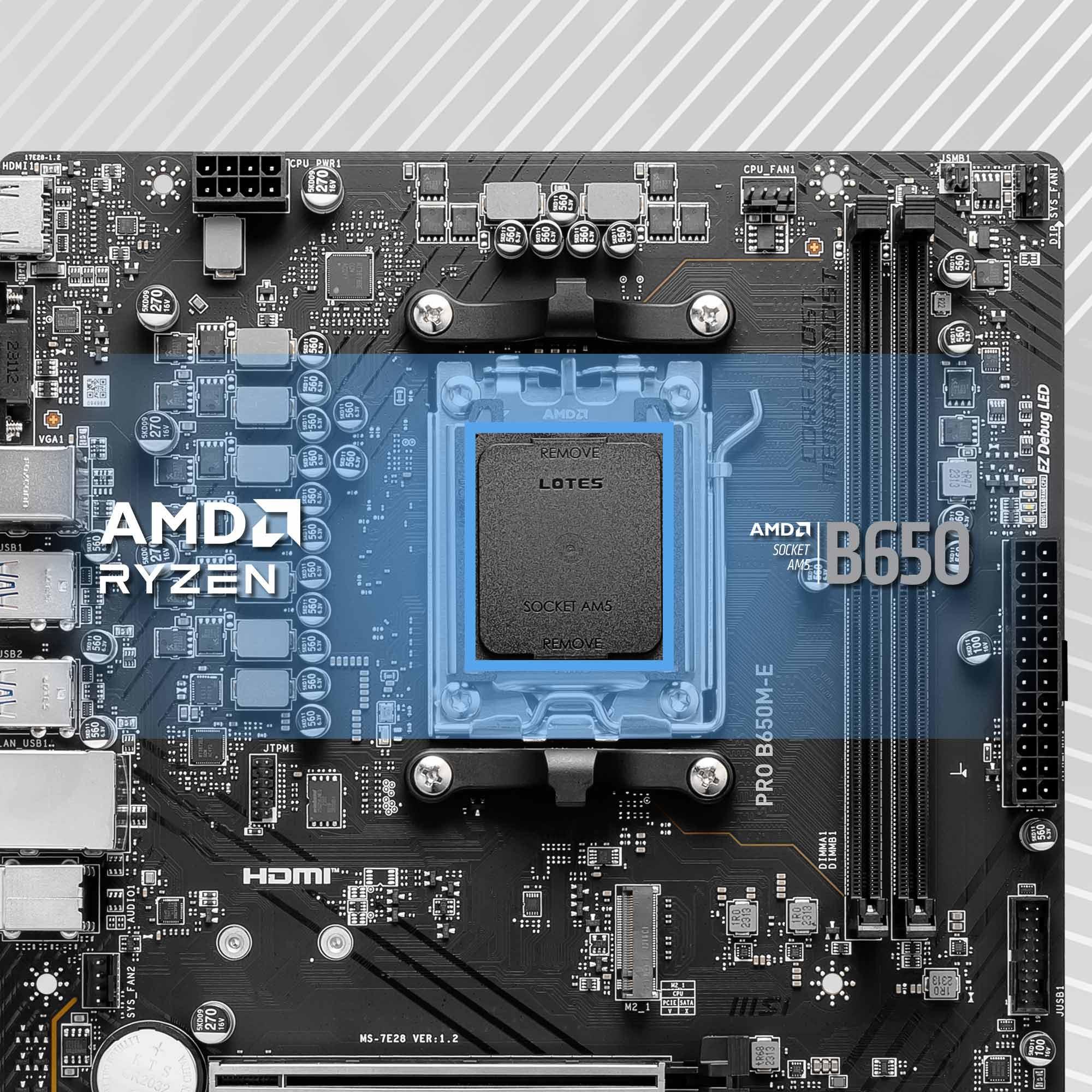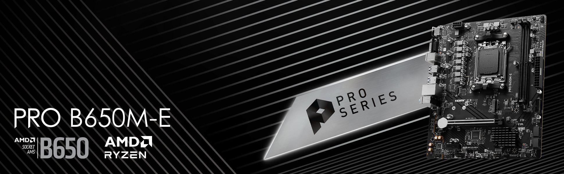 PRO B650M-E, iş için tüm ihtiyaçlarını karşılayan en yeni AMD B650 yonga setine sahip bir Micro-ATX anakarttır.