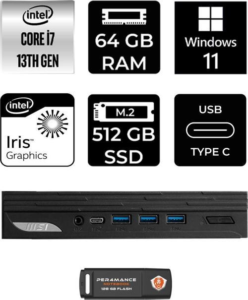MSI Pro DP10 Intel Core i7 1360P 64GB 512GB SSD W11H Mini PC & PER4 USB Bellek 13M001EUP347