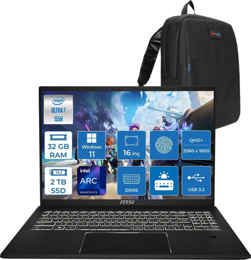 MSI Summit E16 Aı Evo A1MTG Intel Ultra 7 155H 32 GB 2tb SSD Arc Graphics 16" QHD+(2560X1600) 165Hz IPS Dokunmatik WIN11HOME Ikisi Bir Arada Notebook 015TRH04+ZETTAÇANTA