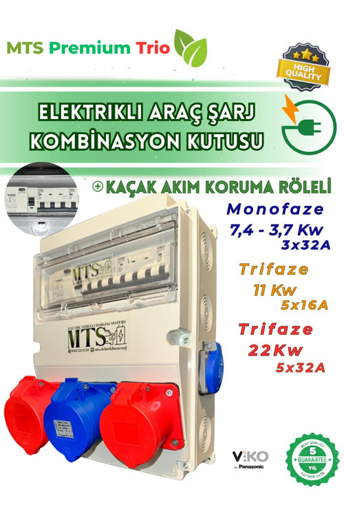 MTSevcharger 22Kw + 11Kw + 7.4Kw 3 Lü Kombinasyon Kutusu V'Ko Kaçak Akım Ve Sigorta Elektrikli Araç Şarj Cihazı