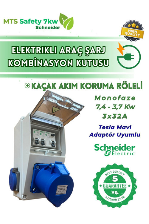 MTSevcharger 7.4 Kw Schneıder Kaçak Akım Roleli Elektrikli Araç Şarj Cihazı Kombinasyon Kutusu Tesla Mavi Adaptör