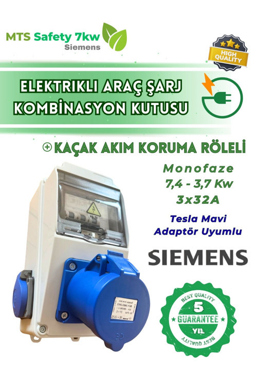 MTSevcharger 7.4 Kw Siemens Sigorta Elektrikli Araç Şarj Cihazı Kombinasyon Kutusu Tesla Mavi Adaptör Uyumlu