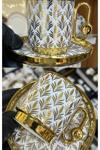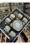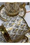 - Porselen malzemesi sayesinde uzun ömürlü ve dayanıklı kullanım sunar.; - 12 parçadan oluşan set, 6 kişilik kahve fincan takımı ihtiyacınızı karşılar.; - Her fincan 90 ml hacme sahiptir, bu sayede ideal boyutta ve rahat bir içim deneyimi sağlar.; - Modern tasarımı ile ev dekorasyonunuza şık bir dokunuş ekler.; - Altın rengi detayları ile göz alıcı bir görünüm sunar ve sofralarınıza zarafet katar.