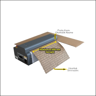 6mm ve daha ince kalınlıktaki kartonları, petek benzeri şekilde dolgu malzemesi yapan model, sınırsız uzunluk ölçüsünde karton kesebilir.