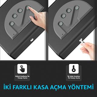 Dileyen kullanıcı 4 kademeli ve 6 haneli dijital şifre algoritması kullanarak çelik saat kasasını açabileceği gibi, dileyen kullanıcı da beraberinde gelen 2 adet yedek anahtarı kullanarak kasayı açabilmektedir. Kasayı kapatmak için ise sadece üzerine örtünmesi yeterli olacaktır.