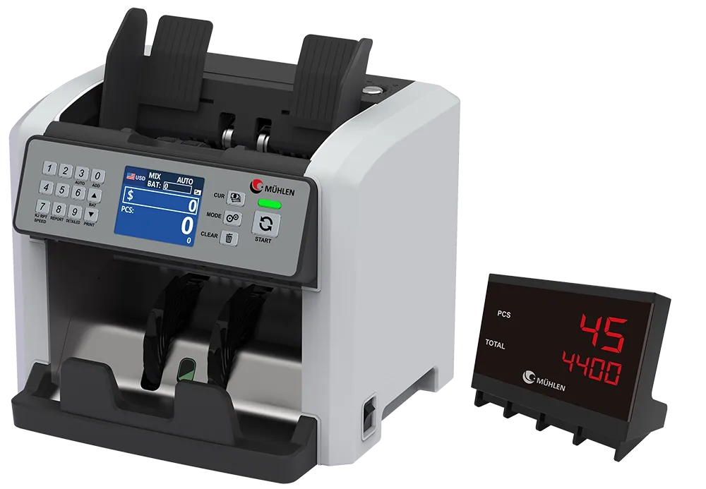 MÜHLEN Raptor C57 modeli, CIS (Contact Image Sensor) teknolojisine sahip model, üstten beslemeli sayım şekli ile, kullanımı son derece basittir. Model eski ve yani parayı tek seferde seri bir şekilde sayabilmektedir.