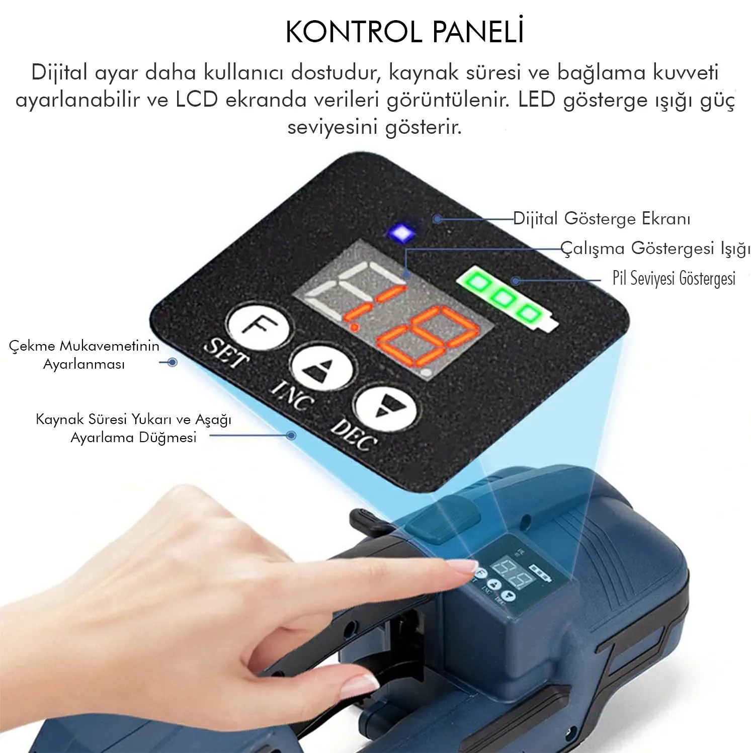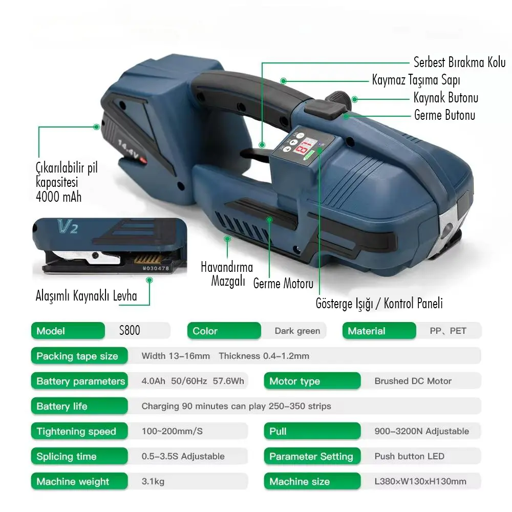 Eşyaların çemberini sıkmak için güçlü DC motor ve sistemine sahip model gün boyu yoğun kullanım için uygundur. Makine 100~200mm/Saniye arasında kayış gerebilmektedir.