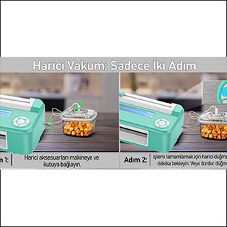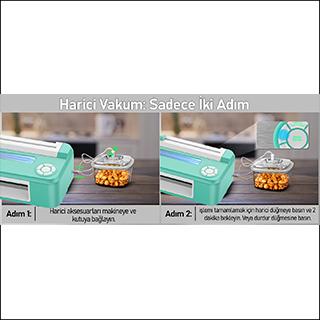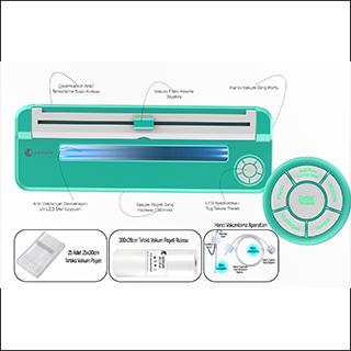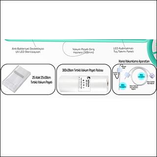 4 Adet LED UV ışık sistemi, vakum anında sterilizasyona yardımcı olur. Diğer taraftan ise şeffaf olan vakum penceresinin içinin aydınlatılmasını ve kullanıcı tarafından rahatlıkla kontrol edilmesini sağlar. Kullanıcı her iki ucu açık olan vakum torbasının bile, bir tarafına sadece mühürleme komutu verebilir, diğer ucuna ise gıdaları içine doldurduktan sonra vakumlama komutu verebilmektedir.