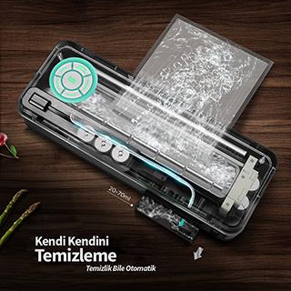 Kendi kendini temizlemesi hiç bu kadar kolay olmamıştır. Kullanıcının tek yapması gereken normal vakum poşetine 20~70ml (yarım çay bardağı) arasında saf su veya bulaşık deterjanlı su doldurarak makinenin vakum ağzına yerleştirmek ve ardından “TEMİZLE” butonuna basmak olacaktır. Geri kalan temizleme işleminin tamamını makine otomatik yapacak ve atık suyu arkadaki çıkartılabilir çekmeceye dolduracaktır.
