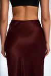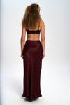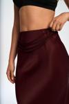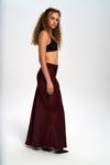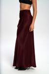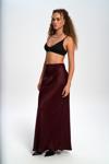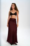Yüksek belli, A kesim saten etek. Düz formu ve hafif parlak doku. Arka fermuar kapamalıdır. Astarsızdır.
