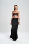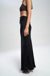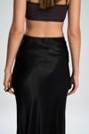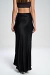 Yüksek belli, A kesim saten etek. Düz formu ve hafif parlak doku. Arka fermuar kapamalıdır. Astarsızdır.
