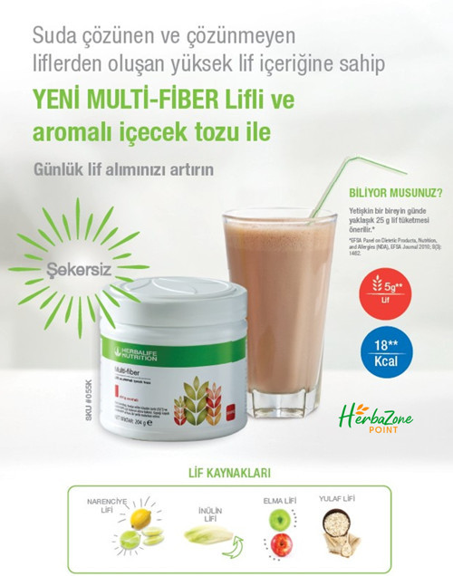 Multi-Fiber, Herbalife tarafından geliştirilen, Çözünür ve çözünmez liflerin özel bir karışımı olan Multi-fiber ile günlük lif alımınızı artırın. Multi-fiber tatlandırıcı içermez ve sadece beş doğal lif kaynağı ile formüle edilmiştir – yulaf, elma, inülin, narenciye, akasya sakızı. Bu lezzetli elma aromalı tozun her bir ölçü kaşığı 5 gram lif sağlar.