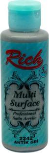 Rich Multi Surface 120 cc Antik Gri 2242 Akrilik Boya Her yüzeyde kullanabileceğiniz Rich multi surface boyalar, hobi meraklılarının sıklıkla kullandığı bir üründür.; En kullanışlı Rich multi surface boyaya ulaşabileceğiniz internet sitemiz, çeşitli renk kataloğu ile siz değerli müşterilerimizin beğenisine sunuluyor.; Metal boyama, plastik boyama, ahşap boyama, kanvas boyama, seramik boyama, cam boyama, lake ve diğer birçok zeminde kullanılabilen Rich multi surface boya kataloğuna Bidoluhobi’den ulaşabilirsiniz.; En renkli tasarımlarınızı oluşturabileceğiniz Rich multi surface boyanın renk kartelası da oldukça zengin.; Dilediğiniz rengi mağazamızdan seçebilir ve tasarımlarınızı renklendirmenin keyfini çıkarabilirsiniz.; Tasarım yapanların ve el emeği ile figürler üretenlerin en önemli sorunlarından birisi olan renklendirme sorununun çözümü Rich multi surface boyalar ile çözülüyor.; Akmayan, kolayca kavlamayan ve kolay kullanımı ile boyama işlemini eziyet haline getirmeyen bu boyaya, Bidoluhobi portföyünden rahatça erişebilir ve güvenle sipariş verebilirsiniz.; Birçok yüzeyde kullanılabilen en kullanışlı Rich multisurface boya ile tasarımlarınızı renklendirebilir ve rahatlıkla sürebilirsiniz.; Hobicilerin en çok kullandığı ürünlerden birisi olan Rich multisurface boyalar, kolay kullanımı ile son zamanlarda çok revaçta olan bir ürün.; Hem Rich Multi Surface renk çeşitleri'ne hem de renk kartelasına göz atarak dilediğiniz rengi seçebilir ve hızlı kargo politikamızdan faydalanarak en ucuz Rich Multi Surface boya sahip olabilirsiniz.; 120cc Rich multi surface boya ile yaklaşık 1-1.5 metrekare alan boyayabilir ve istediğiniz her yüzeyi renklendirebilirsiniz.; Multi Surface Boya Nasıl Uygulanır? Su bazlı multi surface boya metal, plastik, ahşap, kanvas, seramik, cam yüzeylere ince bir fırça yardımı ile direkt olarak uygulanabilir.; Siparişleriniz bidoluhobi tarafından özenle hazırlanır ve en kısa sürede ilgili kargo firmasına teslim edilir