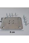 Mobilya bağlantı elemanları kategorisinde yer alan bu ürün, 8 cm x 8 cm boyutlarında ahşap bağlantı saçı ile düz metal aparatı bir arada sunar