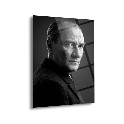 Mustafa Kemal Atatürk’ün siyah beyaz klasik portresini yansıtan bu özel cam tablo, sadelik ve güçlü ifade ile dikkat çeker.