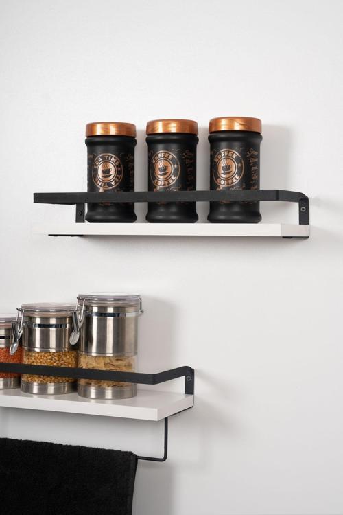Eşya Koruma Bariyeri: Rafın etrafını saran siyah metal çerçeve, üzerine yerleştirilen objelerin düşmesini engelleyerek güvenli bir kullanım sağlar.