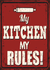 “My Kitchen, My Rules!” Yani: “Burası benim mutfağım, kurallar da bana ait!” Bu net ve eğlenceli mesajla tasarlanmış bu poster, mutfağın sahibi kimse onun hükmünü duvara asar. Retro kırmızı zemin, yıpranmış baskı efekti ve klasik tipografiyle vintage mutfak dekoruna güç katar.