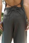 Arkada bağcık detaylı, ön kapama düğmeli, sırt pencereli, pis dikiş, keten karışımlı yelek.