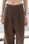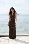 Yan dikişte pis dikiş detaylı, pilili, patlı, bol paça, keten karışımlı pantolon.