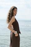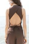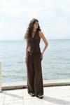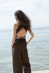 Arkada bağcık detaylı, ön kapama düğmeli, sırt pencereli, pis dikiş, keten karışımlı yelek.