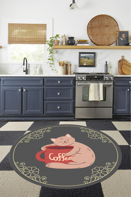 Baskılı Modern Kedi Motifli Yıkanabilir Kaymaz Taban Yuvarlak Salon Mutfak Halısı