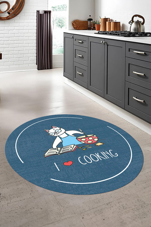 Napoli Home Baskılı Yemek Pişiren Kedi Motifli Yıkanabilir Kaymaz Taban Yuvarlak Mutfak Halısı