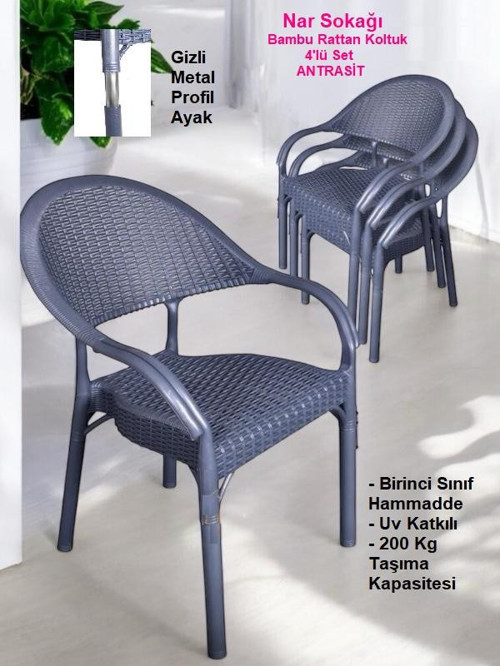 - Bahçe Sandalyesi 4'lü (4 ADET ) Bambu Rattan Tasarımı, Gizli Metal Ayaklı Koltuk Seti ile Balkon Bahçe Teras ve Diğer tüm alanlarda zevkinize göre Renkli ve etkileyici mekanlar oluşturun, Gizli Profil Metal ayakları sayesinde ekstra sağlamlık ve dayanıklılık sunar, Hava alan rattan tasarımı ile terletme yapmaz, Dış mekan şartlarına karşı yüksek dayanıklılık. Bambu Rattan Koltuk Şık tasarımı ve kullanışlılığı ile son derece konforlu kullanım sunar. Bambu Koltuk Ürün Özellikleri Paket İçeriği : 4 Adet Koltuk Kollu - Rattan Desen