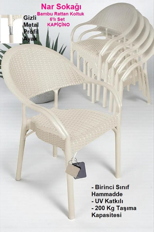 - Bahçe Sandalyesi 6'lı ( 6 ADET ) Bambu Rattan Tasarımı, Gizli Metal Ayaklı Koltuk Seti ile Balkon Bahçe Teras ve Diğer tüm alanlarda zevkinize göre Renkli ve etkileyici mekanlar oluşturun, Gizli Profil Metal ayakları sayesinde ekstra sağlamlık ve dayanıklılık sunar, Hava alan rattan tasarımı ile terletme yapmaz, Dış mekan şartlarına karşı yüksek dayanıklılık. Bambu Rattan Koltuk Şık tasarımı ve kullanışlılığı ile son derece konforlu kullanım sunar. Bambu Koltuk Ürün Özellikleri Paket İçeriği : 6 Adet Koltuk Kollu - Rattan Desen