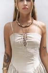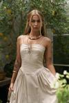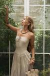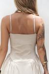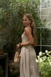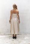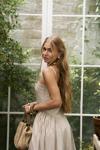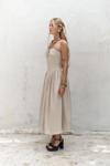 İnce askılı, düz yaka midi elbise. Bel kısmı oturan formda, etek yan büzgü detay, geniş kesim. Astarlı.