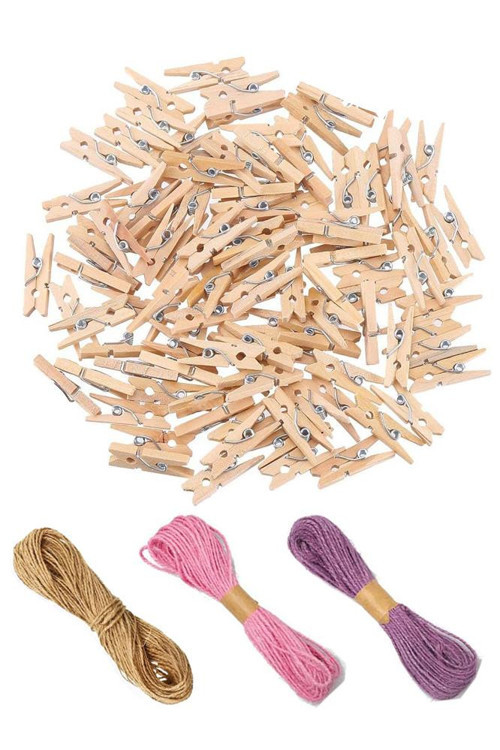Ürün Adı: Naturel Mini Mandal Ahşap 50 Adet ve Jüt Kırnap İpi 3 Adet Dekoratif Süsleme Fotoğraf Asma Mandalı Dekarasyon