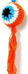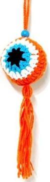 Nazar boncuğu desenli el örgüsü ürünümüz turuncu orlon ip ile üretilmektedir. Püsküllü araba süsümüzün yuvarlak kısmı 7 santimetre çapındadır. Ürünümüz 23 santimetre boyundadır.