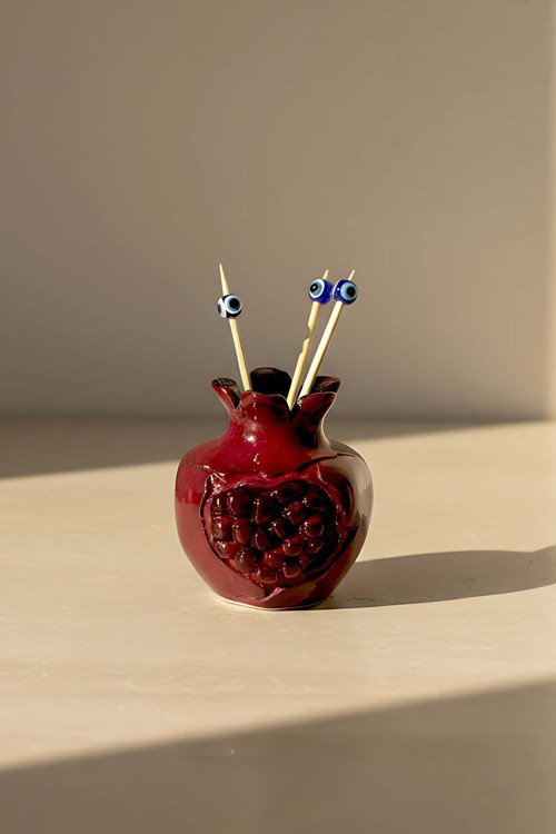 Sofralarınıza hem şıklık hem de anlam katacak özel tasarım nar figürlü kürdanlık. Bereketi simgeleyen nar formu ve nazar boncuk detaylı kürdanlarıyla dekoratif bir görünüm sunar. Kompakt 5x5 cm ölçüsü sayesinde masa üzerinde yer kaplamadan estetik bir dokunuş sağlar.