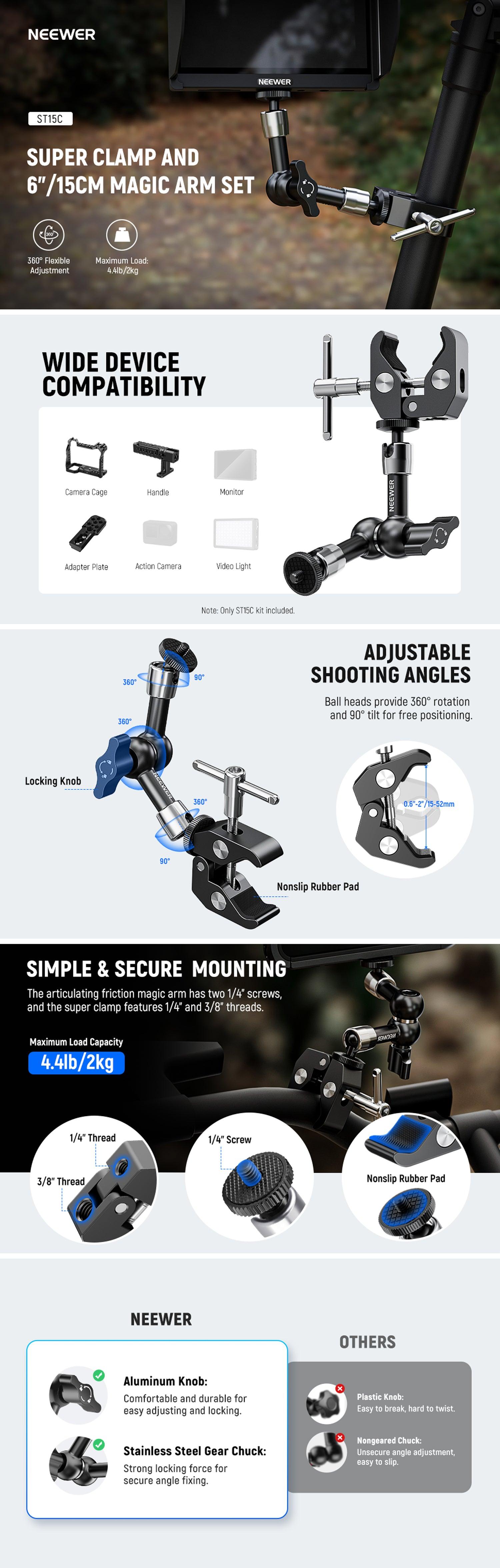 - Basit ve Güvenli Montaj - Mafsallı sürtünmeli sihirli kol iki adet 1/4" vidaya sahiptir ve süper kelepçe 1/4" ve 3/8" dişlere sahiptir. Dayanıklı alüminyum alaşım ve paslanmaz çelik malzeme aşınmaya ve paslanmaya karşı dirençlidir ve 4,4 lb/2 kg'lık maksimum yük kapasitesi sağlar.