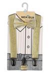 - Çocuklar için özel olarak tasarlanmış, şık ve eğlenceli bir aksesuar olan erkek çocuk sarı pantolon askısı ve papyon seti, miniklerin tarzını tamamlar