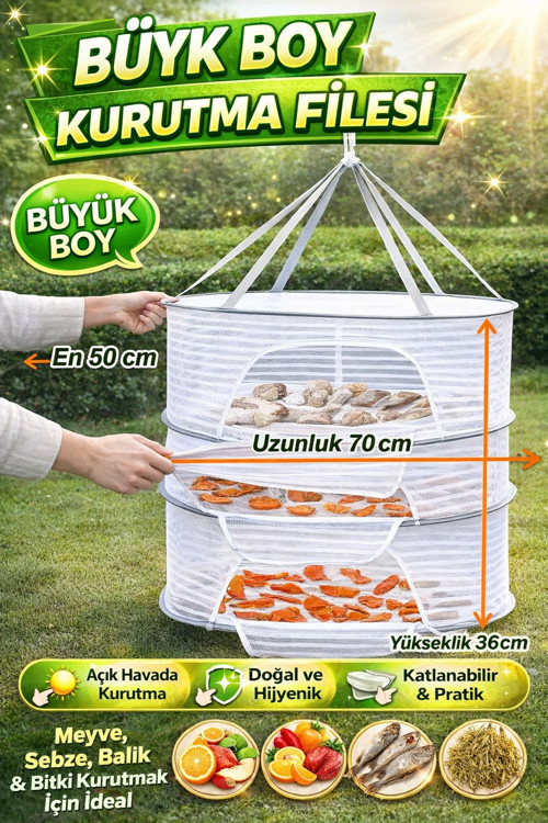 Bu 2 raflı bölmeli kurutma filesi; meyve, sebze, bitki, balık ve benzeri ürünleri açık havada, güneş altında ve hijyenik şekilde kurutmanız için tasarlanmıştır.