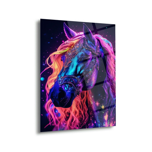 Canlı neon tonları ve büyüleyici detaylarıyla tasarlanan bu özel galaksi at temalı cam tablo, modern dekorasyona enerjik, dikkat çekici ve özgün bir dokunuş kazandırır.