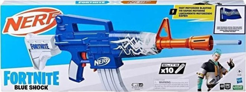 Nerf Fortnite Blue Shock blaster, Fortnite'ta kullanılan ekipmanlardan ilham almıştır ve video oyunundan Blue Shock Wrap içinde gelir.