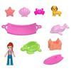 -Plajda heyecan verici bir gün için mini oyun setinin içerisinde, bebeklerin oynayabileceği kumdan deniz kızı, sallanabilecekleri bir hamak ve hayvan dostlarıyla yüzüp suda dönebilecekleri bir gelgit havuzu bulunur.