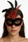 - Kırmızı dantel, siyah ve kırmızı tüyler ve siyah süet kaplama ile süslenmiş göz alıcı bir parti maskesi tasarımı.