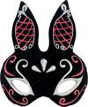 Bu siyah süet kaplama tavşan maskesi, kırmızı ve beyaz simlerle süslenmiş göz alıcı bir tasarıma sahiptir. 18x16 cm boyutlarındadır ve çoğu yetişkine uygundur.