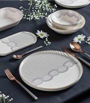 6 kişilik yuvarlak yemek takımı seramikten üretilmiştir. Renk: Beyaz - Altın Malzeme: Seramik Toplam 27 parçadır. Ölçüler: 6 adet 26 cm servis tabağı 6 adet 18 cm çukur tabak 6 adet 20 cm pasta tabağı 6 adet 14 cm çorba kasesi 1 adet 28.5 cm salata tabağı 2 adet 22 cm Kayık,sunum tabak Uyarı: Tabak kenarları altın yaldız detayları olduğu için elde yıkanması tavsiye edilir . Tabaklar kenarı dik model formundadır.