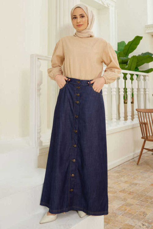 Neways 2079-düğmeli Kot Etek Lacivert
