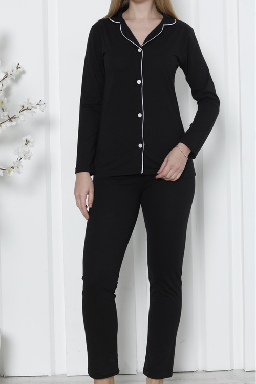 Kadın Pijama Takımı Uzun Kollu Düğmeli Pamuklu Biyeli Gömlek